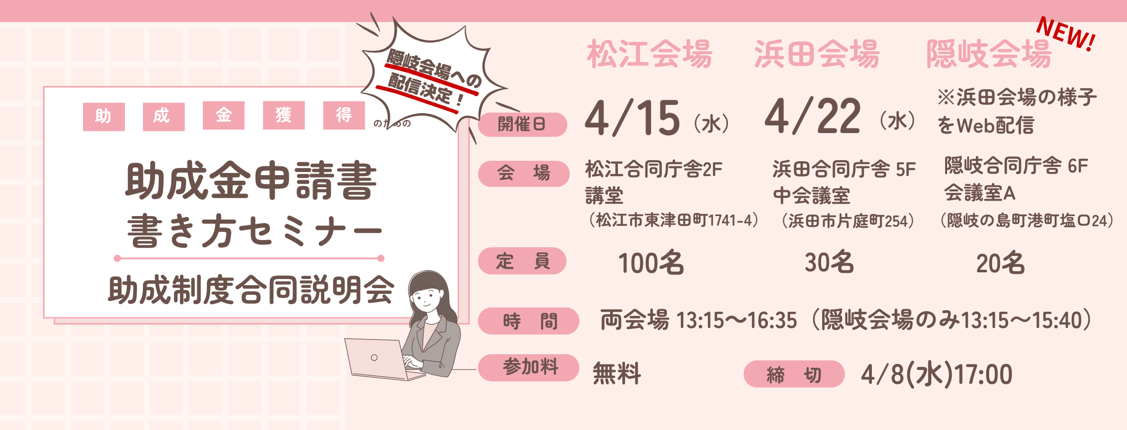 【隠岐会場への配信決定!】助成金申請書 書き方セミナー・助成制度合同説明会
