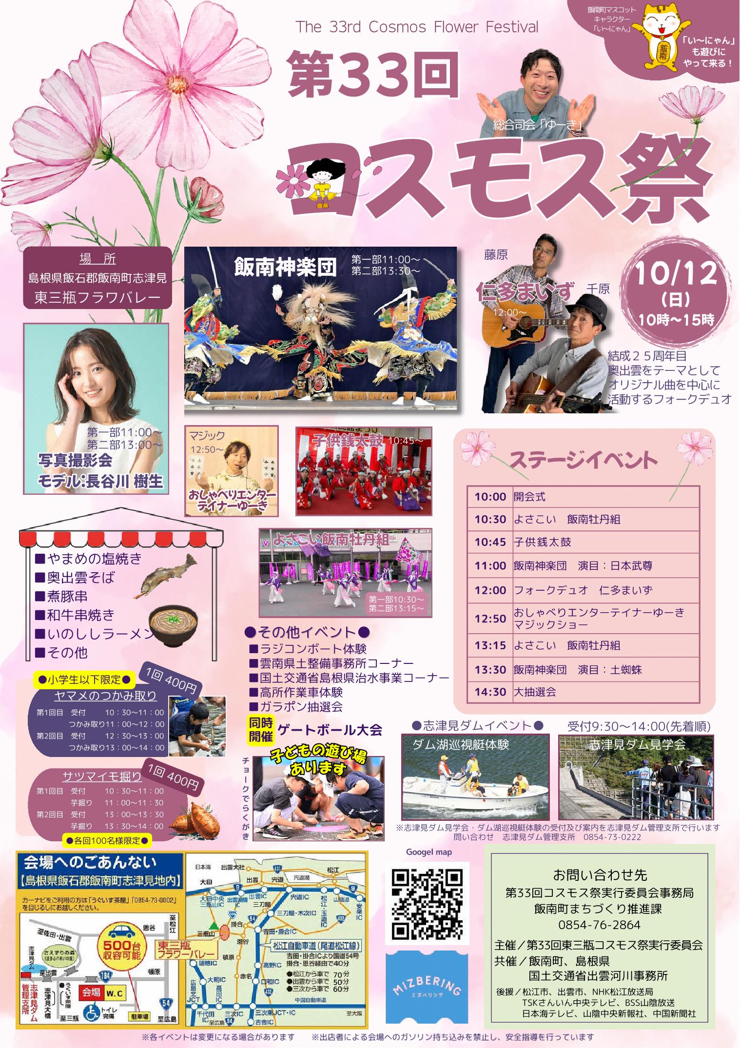 飯南町志津見にある東三瓶フラワーバレーでは、例年9月下旬ごろから10月中旬まで約6ヘクタールの広大な敷地にコスモスの花を咲かせています。
