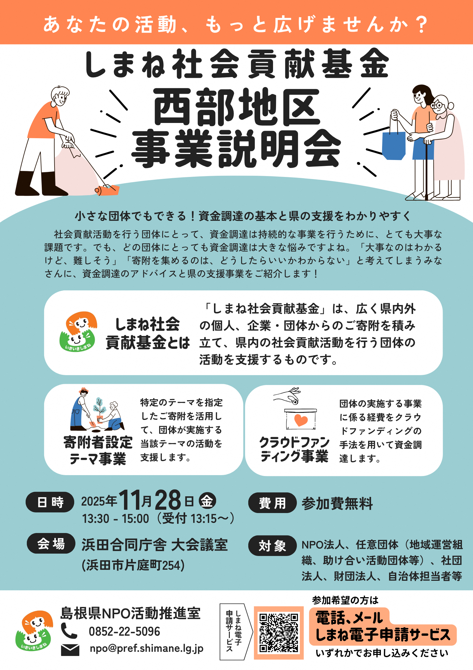 ※「しまね社会貢献基金」は、広く県内外の個人、企業・団体からのご寄附を積み立て、県内の社会貢献活動を行う団体の活動を支援するものです。