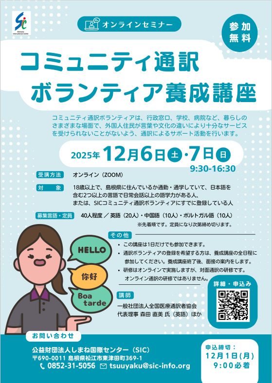 2025年度のコミュニティ通訳ボランティア養成講座を以下のとおり開催しますので、関心をお持ちの方は、ぜひご参加ください!