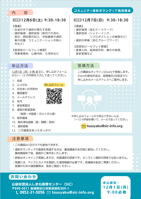 ・18歳以上で、島根県に住んでいるか島根県に通勤・通学していて、日本語を含む2つ以上の言語で日常会話以上の語学力がある方(全日程参加できる方を優先します。)