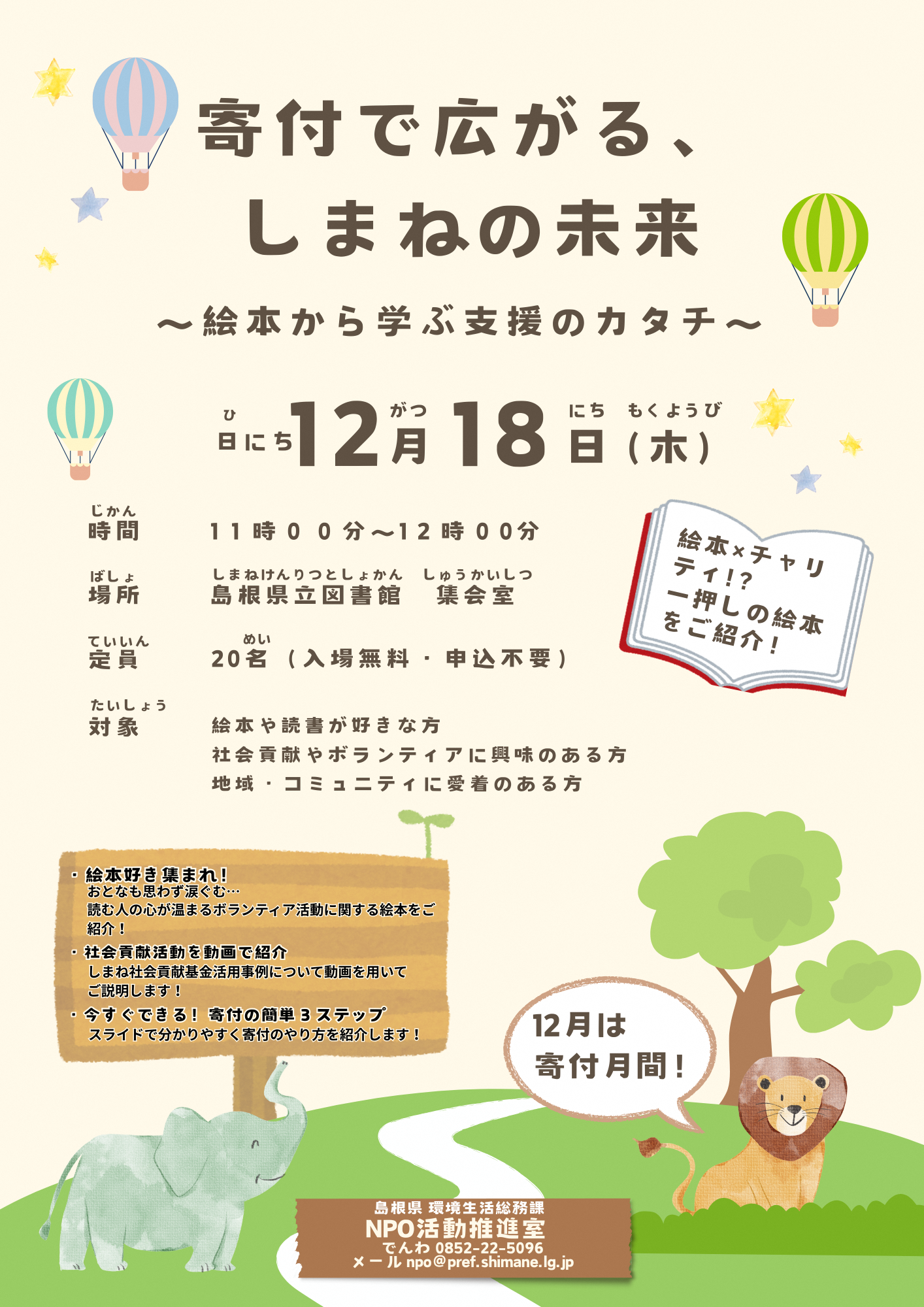 この度、『寄付で広がる、しまねの未来 ~絵本から学ぶ支援のカタチ~』と題し、島根県立図書館で“絵本”と“寄付”に関する特別イベントを開催します! また、本イベントでは、「しまね社会貢献基金」※の具体的な活用事例などについても動画で分かりやすくご説明します。
