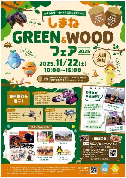 島根県が推進している「木を伐って・使って・植えて・育てる」循環型林業や、「水と緑の森づくり税」、「森林環境譲与税」を活用した取組のPRなどを行うイベントをくにびきメッセにて開催します。