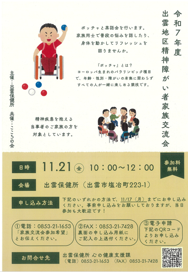 精神疾患を抱える当事者のご家族の方を対象に、ボッチャと茶話会を行います。