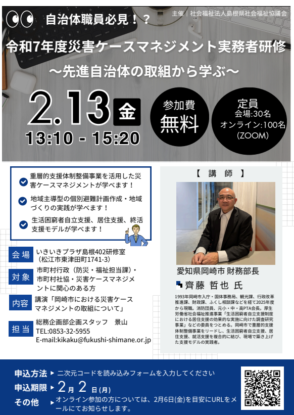 この研修会は、先進自治体が実践している個別避難計画の取組や、重層的支援体制整備事業を活用した平時からの災害ケースマネジメント体制づくりについて学ぶことで、本県における災害ケースマネジメントの体制整備が一層推進されることを目的として研修会を開催いたします。