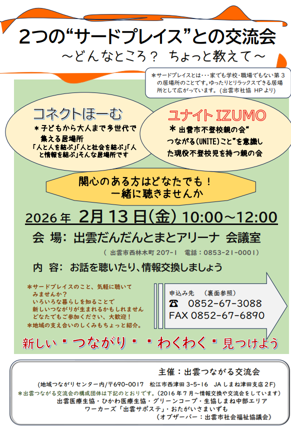 ☆サードプレイスとは・・・家でも学校・職場でもない第 3の居場所のことです。ゆったりとリラックスできる居場所として広がっています。 (出雲市社協 HP より)