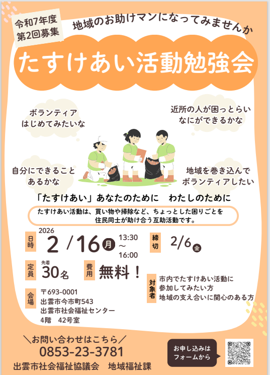 ※メールでの問合せ・申込の際は、件名を「たすけあい活動の勉強会」としてください。