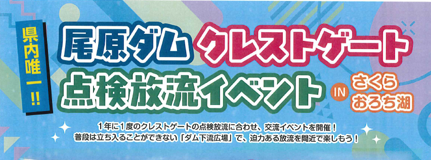 尾原ダムのクレストゲート点検放流に合わせ、「尾原ダム クレストゲート点検放流イベントINさくらおろち湖」を開催します。
