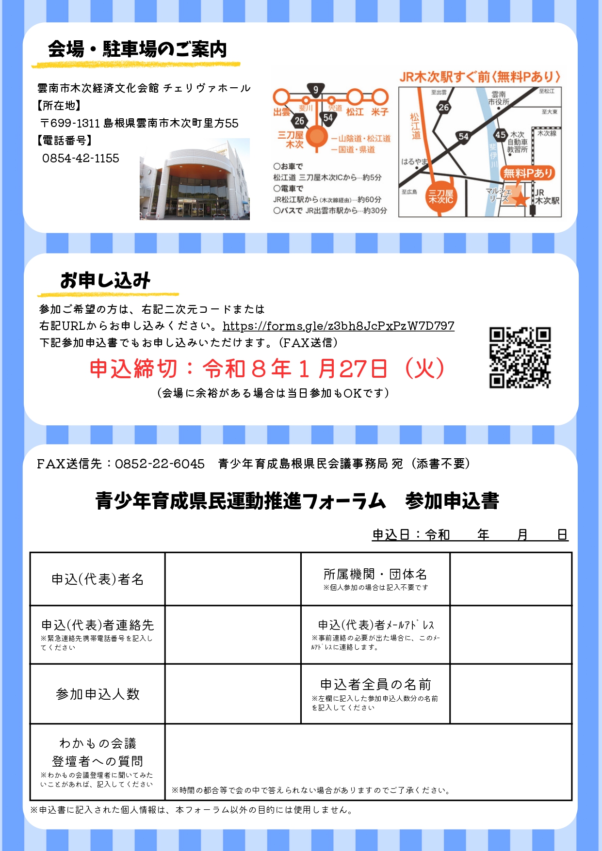 必要事項をご記入の上、県民会議事務局宛にFAX(0852-22-6045)送信してください。