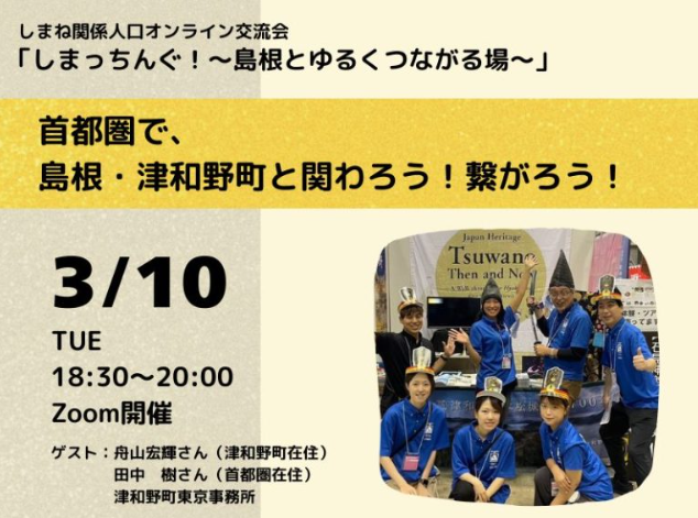 令和7年度第4回目となる3月10日は、東京と津和野町をつなぐ仕掛け人「舟山宏輝〔ふなやま ひろき〕さん」(しまっち!オーナー)と、首都圏在住で島根(特に津和野町)と関わる活動をしている「田中 樹〔たなか いつき〕さん」(しまっち!サポーター)をゲストに迎え、それぞれの活動や今後の取組みをご紹介いただきます!また、東京に拠点のある津和野町東京事務所の担当者もイベント参戦!首都圏にいながら島根(特に津和野町)と繋がることができるイベントになっています!!
