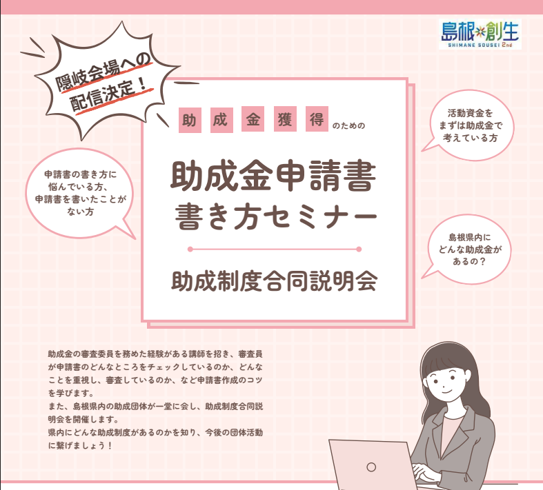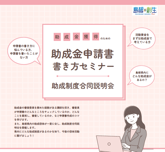 また、同時に島根県内の8団体が一堂に会し、助成制度について説明会を開催します。