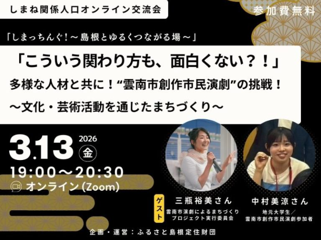 これまでの“市民演劇”の活動や3月末に控えている公演についてお話をお聴きします。あなたと島根との関わり方のヒントがきっと見つかるイベントです!!