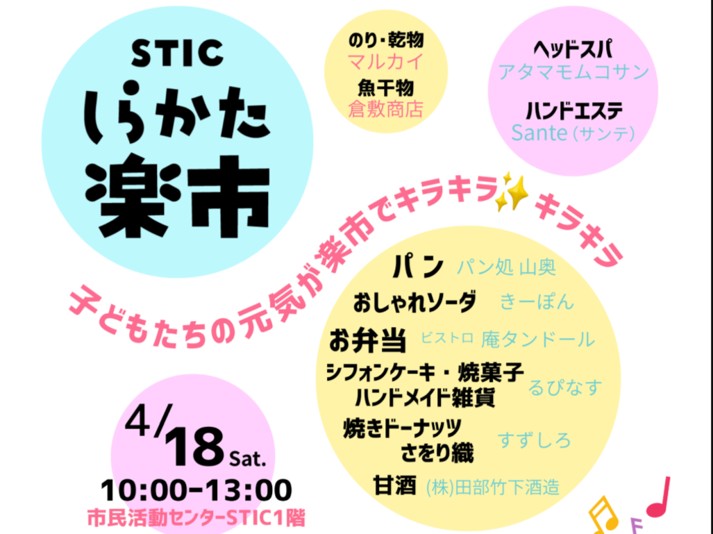 4月18日(土)に開催される STICしらかた楽市 に出演します。