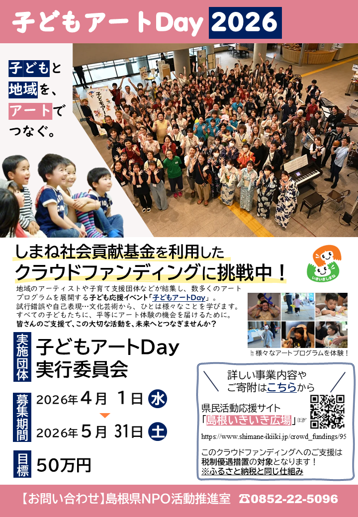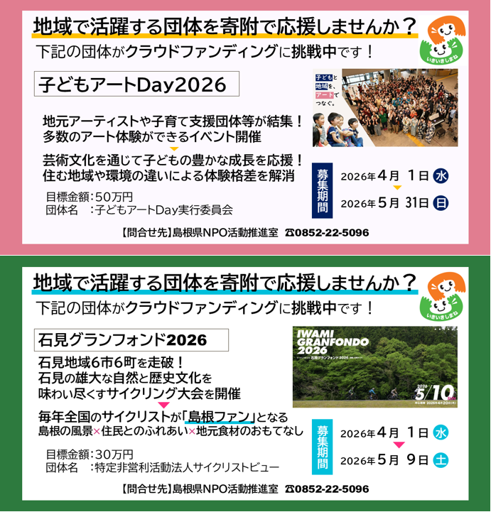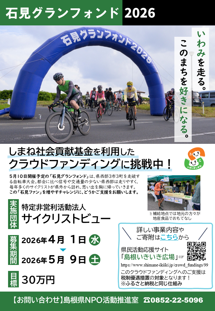 県では、NPO法人等が活動に必要な資金(寄附金)を獲得するために、しまね社会貢献基金を活用したクラウドファンディング事業を実施しています。