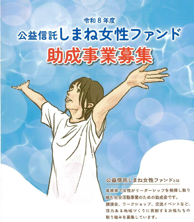 「公益信託しまね女性ファンド」とは、島根県で女性がリーダーシップを発揮し取り組む社会活動事業のための助成金です。講演会、ワークショップ、交流イベントなど、活力ある地域づくりに貢献する女性たちの取り組みを募集しています。