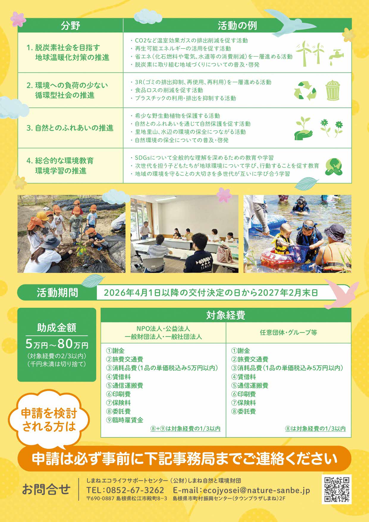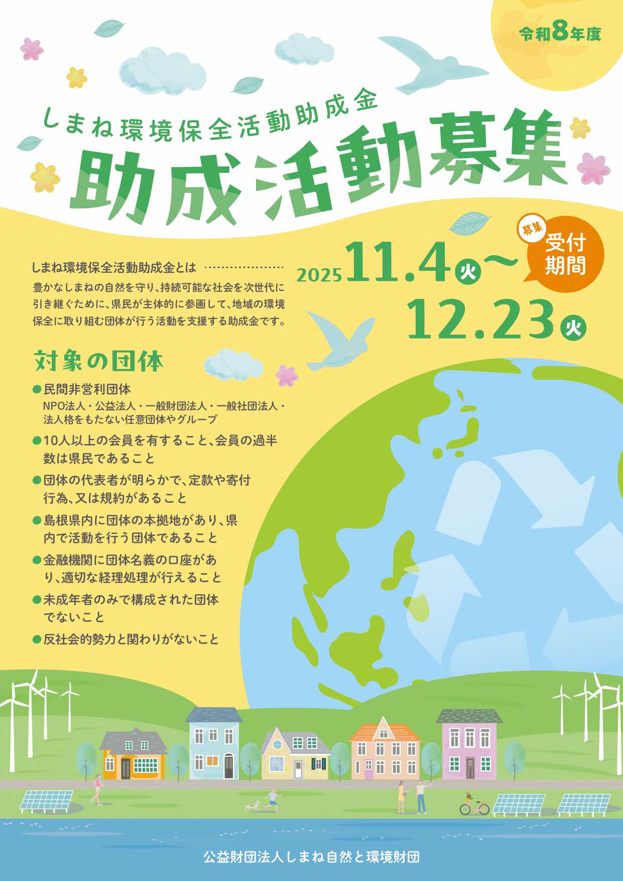 豊かなしまねの自然を守り、持続可能な社会を次世代に引き継ぐために、県民が主体的に参画して、地域の環境保全に取り組む団体が行う活動を支援する助成金です。