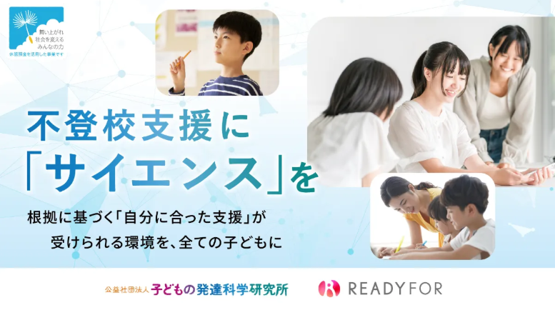 そこで本事業では、休眠預金活用事業として、公益社団法人子どもの発達科学研究所とREADYFOR(株)が資金分配団体(FDO)となり、不登校支援を行う団体に資金的支援および非資金的支援(伴走支援)を提供します。実行団体に、①リーダー層や支援スタッフへの専門的研修の実施、②簡便なアセスメント・モニタリングツールの提供、③地域の連携資源の調査支援、などの包括的な伴走支援を行い、「科学的根拠に基づく支援モデル」の構築を目指します。