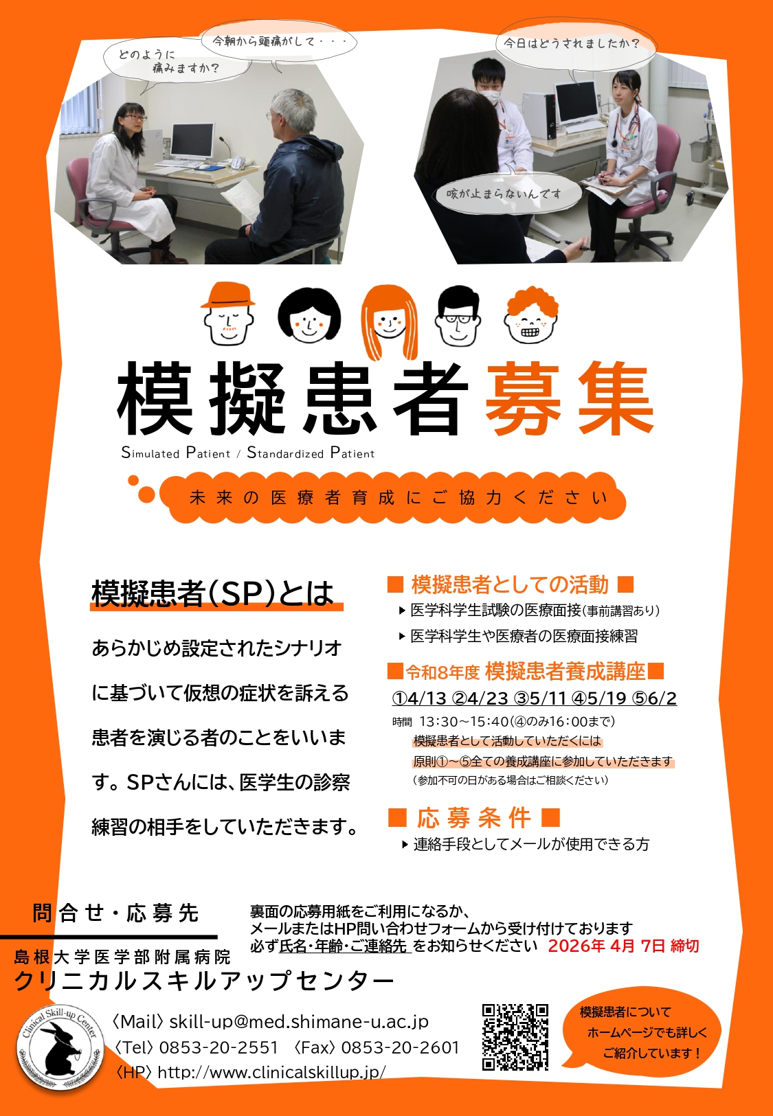 医学生が診察の練習をする際の相手役となる模擬患者のボランティアを募集しています。