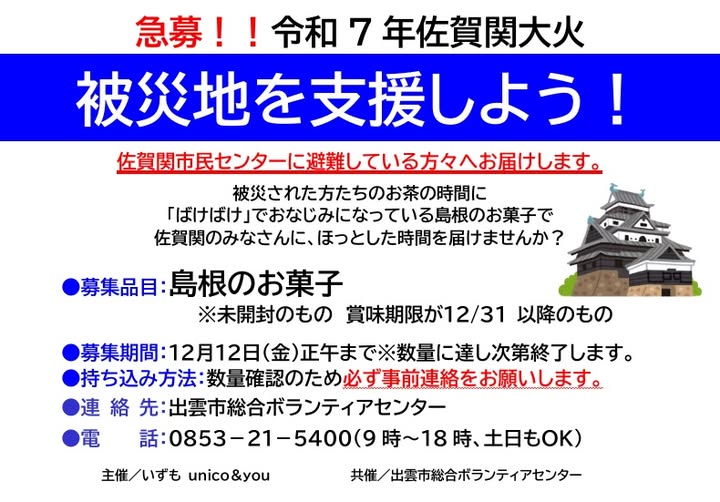 大分県佐賀関大火の被災者支援のため「島根のお菓子」募集!!
